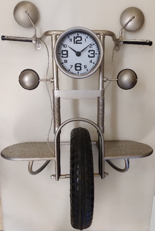 De grijze metalen motor heeft de wijzerplaat in de koplamp. De wijzers worden beschermd door een glas. Ideale wandklok voor in de garage, werkplaats of clubhuis Inclusief gratis batterij.