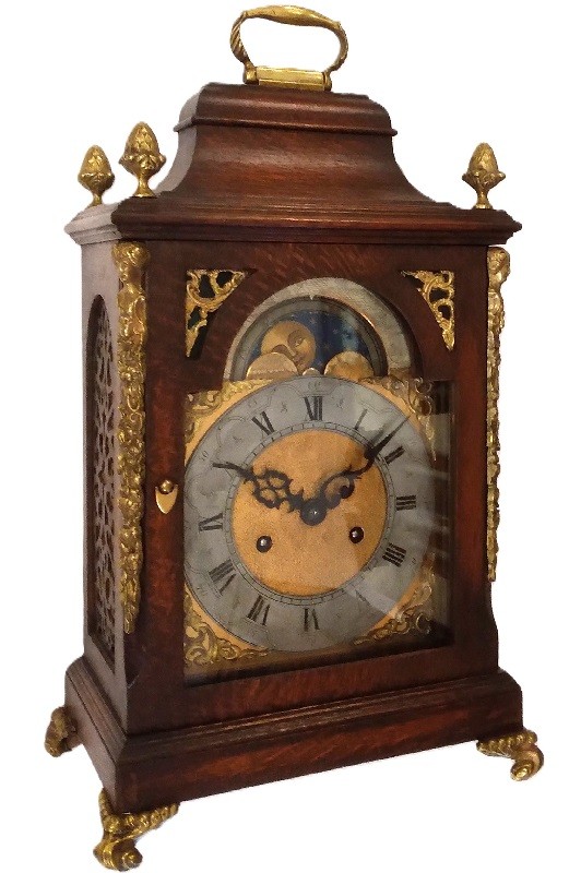 De eiken tafelklok heeft een 8-daags slinger uurwerk met maan aanduiding, ca 1920. De Junghans klok heeft een lichte belslag. Het uurwerk slaat 1x om het half en het aantal uren om het heel op een bel.