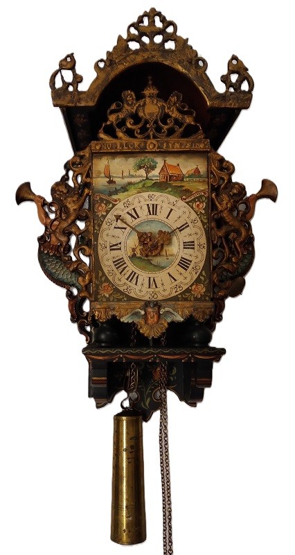 De klok heeft een origineel spillegang uurwerk met een vast klein slingertje i.v.m. de golfbewegingen van het schip (2x per dag het gewicht optrekken). Op de houten achterwand staat het uurwerk met een metalen handbeschilderde wijzerplaat uit de jaren '70.