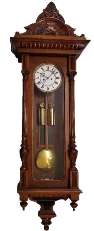 De snaarregulateur heeft een 7-daags uurwerk met slagwerk, ca. 1870. De klok slaat 1x om het half en het urental om het heel op een rondgong. De wijzerplaat is is emaille.