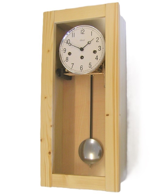 De grenen regulateur heeft een 8-daags uurwerk van het kwaliteitsmerk 'Hermle'. De klok speelt elk kwartier het Westminster melodie en slaat om het heel ook het urental. De wijzerplaatring en de slinger zijn verchroomd. Gehele uitschakeling en automatische nachtuitschakeling van het speelwerk is eveneens mogelijk.
