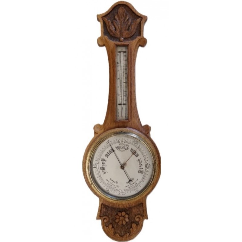 De Engelse licht eiken aneroïde barometer met een verzilverde wijzerplaat heeft eveneens een thermometer, ca. 1890. De wijzers worden beschermd door een facet geslepen glas.