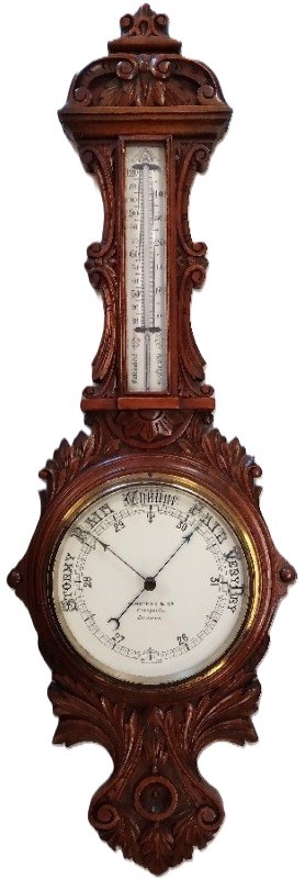 De Engelse noten barometer met een aardewerk wijzerplaat heeft eveneens een thermometer, ca. 1890. De wijzers worden beschermd door een facet geslepen glas. Ges.: Benetfink & Co., Cheapside, London.