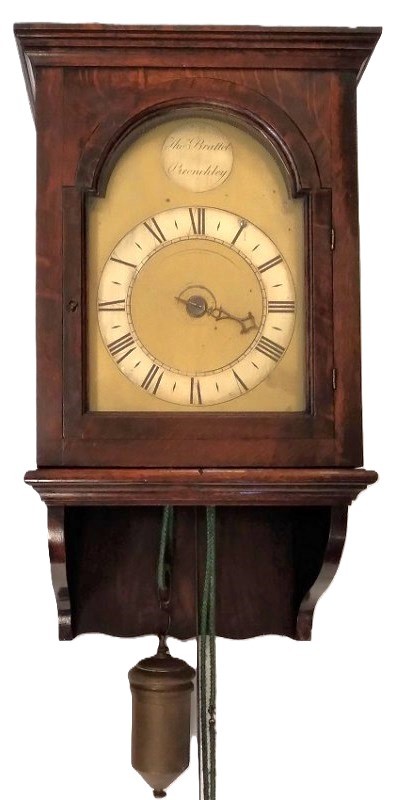 De Engelse wandklok heeft mahonie kast en een bronzen wijzerplaat, ca. 1780. Het 30-uurs uurwerk slaat om het heel het aantal uren op een bel. Gesigneerd: Thomas Brattel, Brenchley.