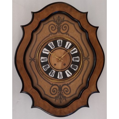 De noten koeienoog met wijzerplaat heeft een 8-daags uurwerk met rondgong, ca. 1880. De oeil de boeuf klok slaat 1x om het half en het aantal uren om het heel op een ronde gong.