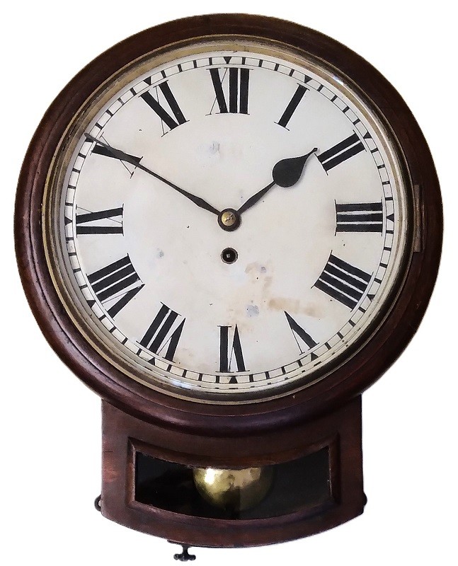 Een mahonie pubklok met 8-daags snek uurwerk, ca. 1880. Het model is 'dropdial' met de slinger zichtbaar . De wijzers worden beschermd door een glas.