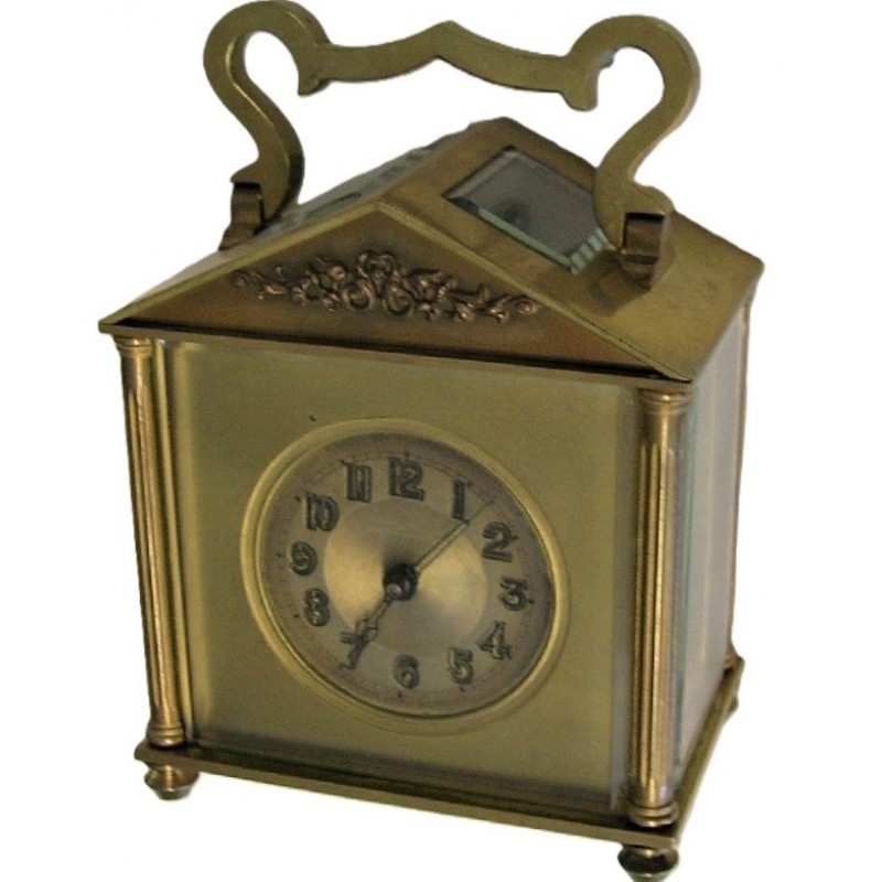 De messing reislok met Frans 8-daags uurwerk, ca. 1900. Aan de achter- en zijkant zijn facet geslepen glaasjes. Op het dakje (Romeinse stijl) zijn tevens twee facet geslepen ruitjes.