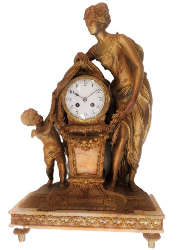 Grote marmeren pendule (61 cm hoog) heeft een 8-daags uurwerk, ca. 1880. De Franse tafeklok slaat 1x om het half en het urental om het heel op een lichte bel. De klok met een geëmailleerde wijzerplaat staat op een marmeren vierkant voetstuk Het romeinse tafereel op de klok: Een vrouwenfiguur en cupido, die de klok onthullen door het doek naar achteren te trekken.