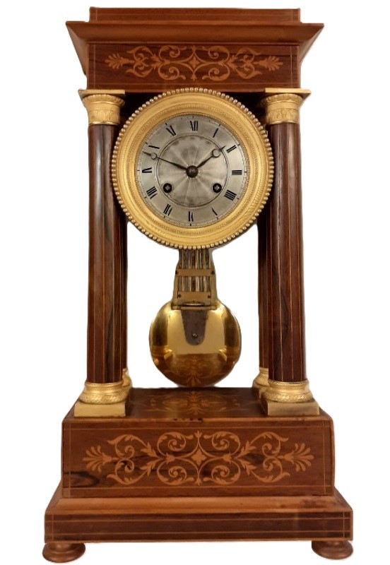 De kolompendule heeft een noten houten kast ingelegd met diverse houtsoorten en een verzilverde wijzerplaat, ca. 1845. Het 8-daags uurwerk met compensatie slinger heeft een lichte belslag. De klok slaat het uren tal op het heel en 1x op het half.