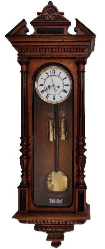 De snaarregulateur heeft een 7-daags uurwerk met slagwerk, ca. 1870. De klok slaat 1x om het half en het urental om het heel op een rondgong. De noten kast is nog in perfecte conditie. De wijzerplaat is emaille.