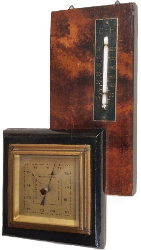 De aneroïde barometer met Nederlandse tekst heeft tevens een thermometer, ca. 1925. Het hout is een combinatie van noten met zwart. De wijzers worden beschermd door een facet geslepen glas.