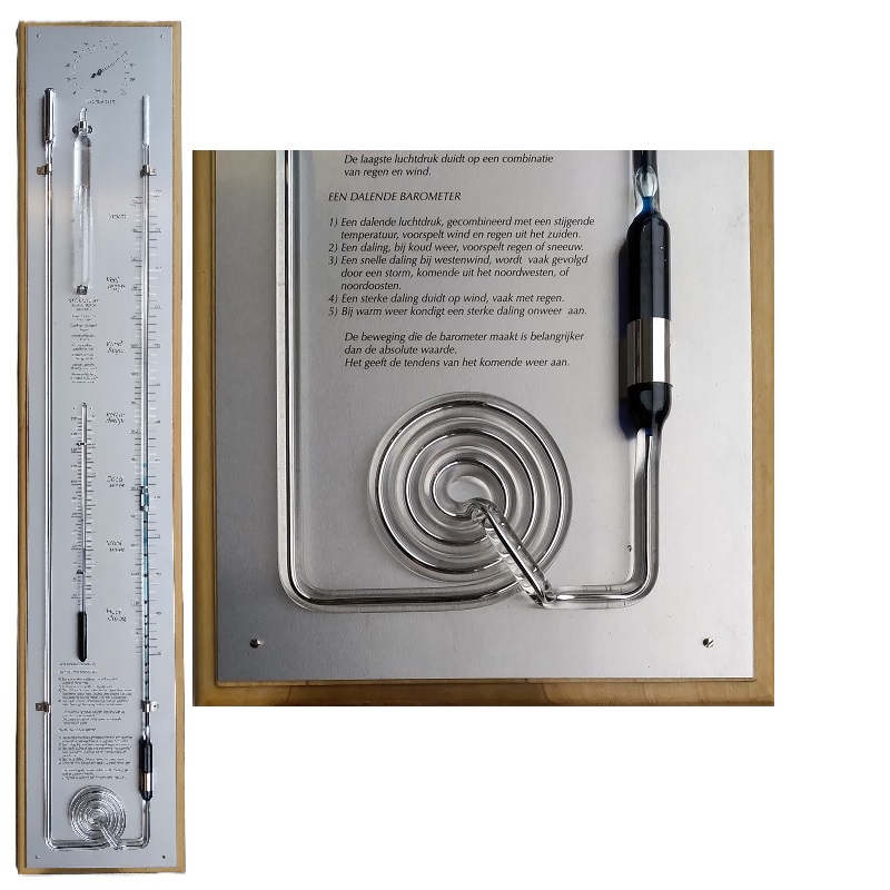 De licht houten contra-barometer heeft naast de barometer een baroscoop, thermo- en hygrometer (meest uitgebreid) op een rvs schaalplaat. De tekst op de barometer is Nederlands.
