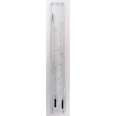 Naast de contra-barometer is er tevens een thermometer aanwezig op de doorzichtige facet geslepen glazen schaalplaat met Nederlandse tekst (barometerschaal in millibaren). De strakke barometer is makkelijk afleesbaar door de donkerblauwe vloeistof op een lichte achterwand.