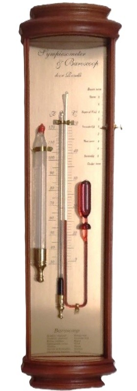 De licht noten sympiesometer met thermometer en baroscoop zijn op een messing schaalplaat met Nederlandse tekst bevestigd. De instrumenten worden beschermd door een fraai gebogen glas.
