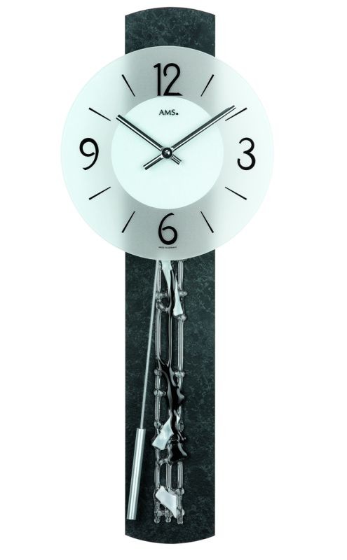 De wandklok heeft een zwarte achterkant met glazen decoraties en heeft een glazen wijzerplaat met verchroomde wijzers. De klok heeft een Duits quartzuurwerk met cilindervormige slinger. Inclusief gratis batterij.