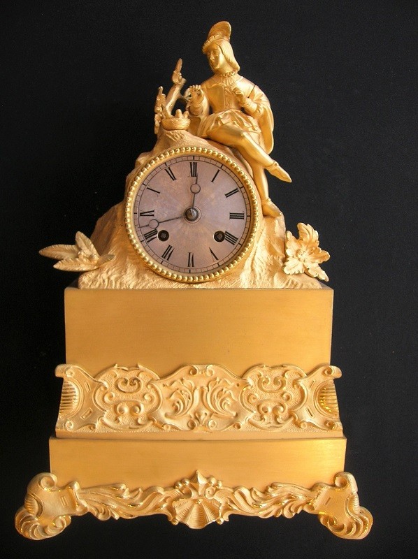 De vuurvergulde pendule, ca.1830, heeft een 8-daags uurwerk met een lichte belslag. De klok slaat het uren tal om het heel en 1x om het half.