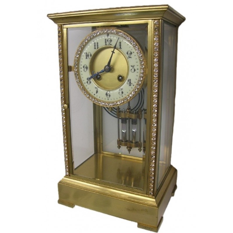 De Franse glaspendule, ca. 1890, heeft een emaille wijzerplaat met kristallen rondom en een messing kwikslinger. In de strakke messing kast met kristallen in de de deur bevindt zich een 8-daags uurwerk met gongslag.