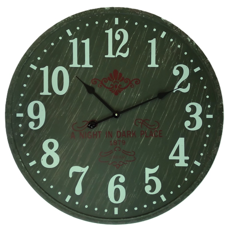 Grote, donkergroene metalen wandklok heeft een quartz uurwerk. Tekst: A night in dark place. Inclusief GRATIS batterij.