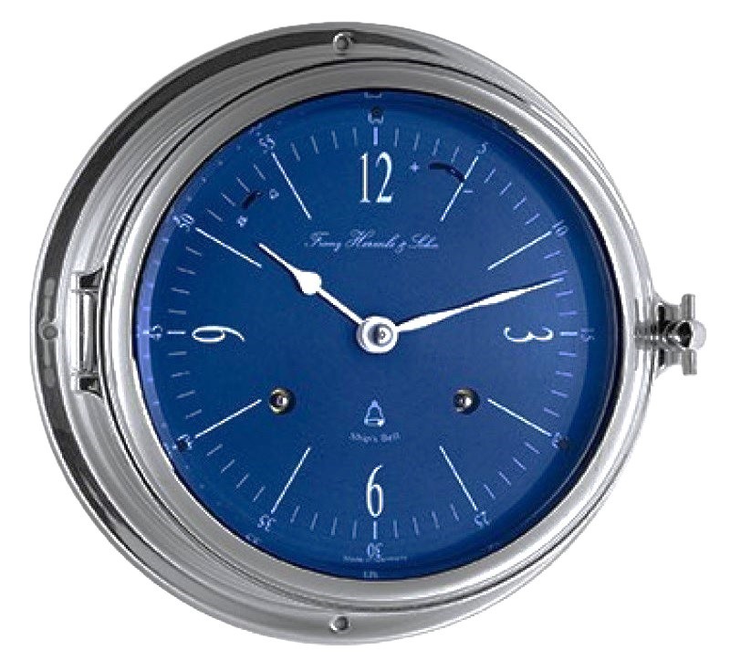 De luxe chromen scheepsklok met donker blauwe wijzerplaat heeft een mechanisch 8-daags uurwerk, die glazen slaat op een bel. De chromen wijzers worden beschermd door een facet geslepen glas in het deurtje (patrijspoort). Uitschakeling van het slagwerk is mogelijk d.m.v. een hendeltje in de wijzerplaat.