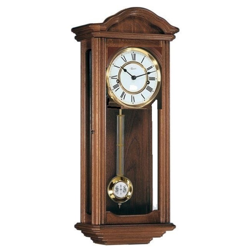 De noten regulateur heeft een 8-daags uurwerk met bimbam-slagwerk. Het uurwerk slaat 1x om het heel en het aantal uren op 3 gongstaven. Er is tevens een hendeltje aanwezig om het speelwerk geheel uit te schakelen.. Beide zijkanten zijn voorzien van glas.
