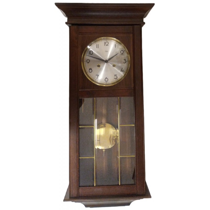 De noten wandklok heeft een mat zilveren wijzerplaat met messing ring en een mesing slinger. Het Duits 8-daags uurwerk heeft een warme bimbam-slag en slaat 1x op het half en het urental op het heel. In de deur is facet geslepen glas-in-lood (messing) verwerkt.