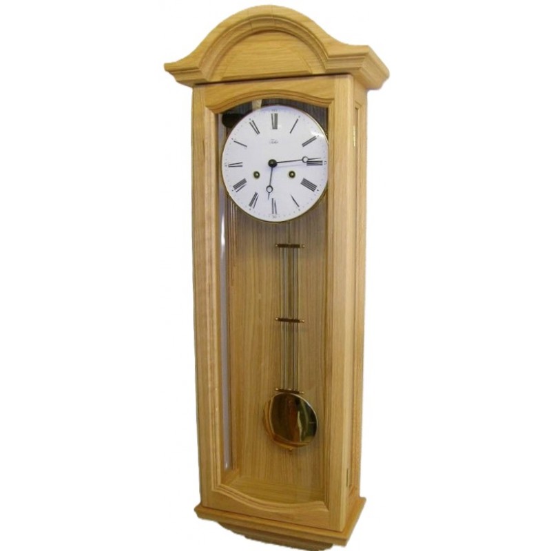 De blankeiken wandklok heeft een witte wijzerplaat en een hoogglans messing slinger. Het Duits 8-daags uurwerk heeft een warme bimbam-slag en slaat 1x op het half en het urental op het heel.