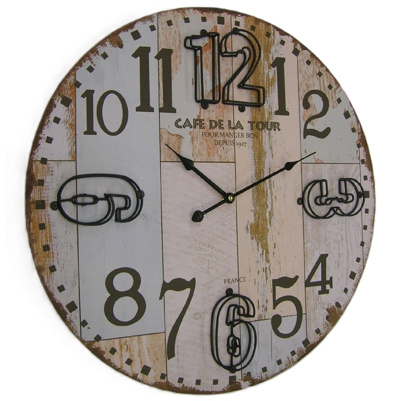 De ronde wandklok met een print van een sloophouten wijzerplaat heeft een quartz uurwerk. De cijfers 3, 6, 9 en 12 zijn in metaal uitgevoerd. Inclusief GRATIS penlite batterij.