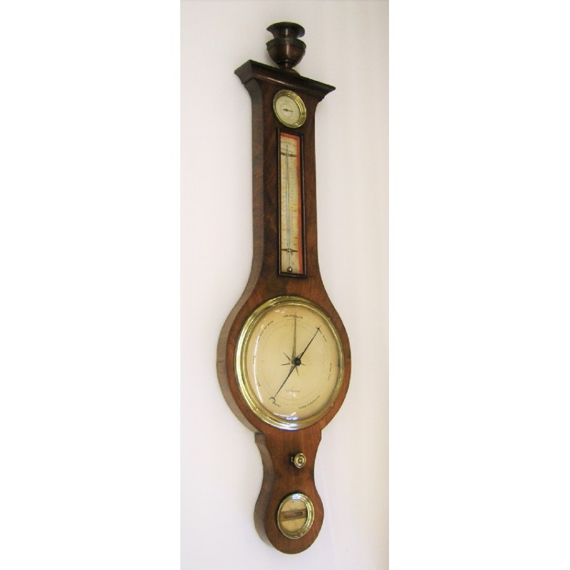 De royale bloemmahonie Hollandse banjo barometer heeft een diepe kast (5 cm) en een groot bol glas (= bijzondere uitvoering). Tevens een thermometer en waterpasje aanwezig, ca. 1870. Onder het bolle glas van de barometer is de tendenswijzer, te bedienen door de afneembare knop onderaan de barometer. Gesigneerd: Ges.: A.D. Bazerga.