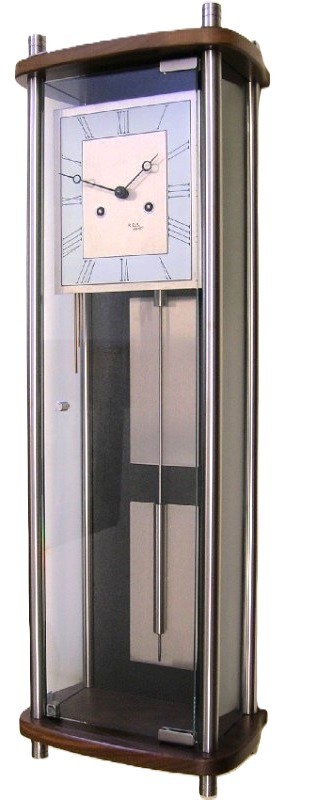 De stoere, noten wandklok heeft vier geborstelde stalen buizen, verticaal geplaatst, waar tussen het glas is bevestigd. Het Duitse week-uurwerk heeft een bimbam-slagwerk, dus slaat 1x om het half en het urental om het heel. De rvs slinger is cilinder-vormig.