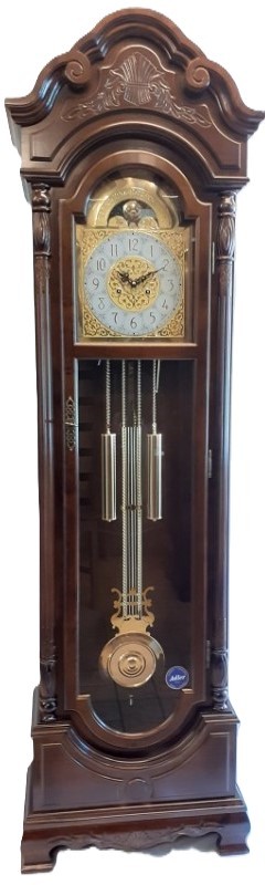 De noten staande klok heeft een opwind uurwerk met messing siergewichten. Het 8-daags uurwerk slaat 1x om het half en het urental om het heel op gongstaven. Uitschakeling van het slagwerk is ook mogelijk. De messing wijzerplaat heeft gewone cijfers. Tevens in een eiken uitvoering verkrijgbaar.