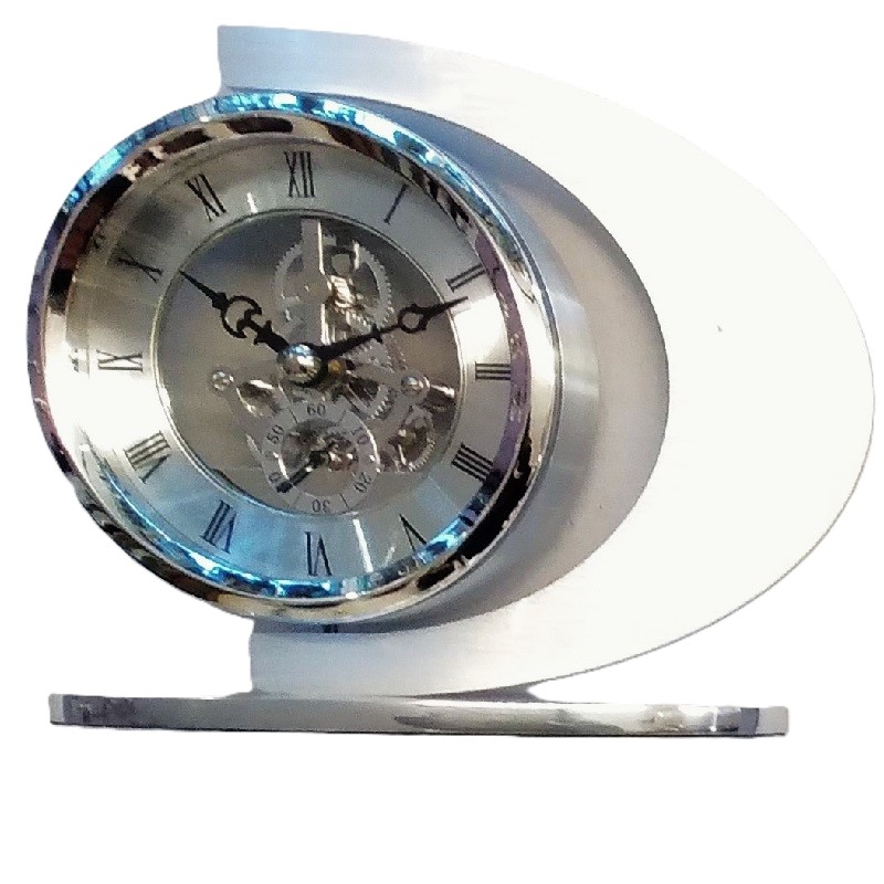 In de zware verchroomde standaard is een rond klokje met een skelet quartzuurwerk plus seconde-wijzer bevestigd. Het uurwerk en de wijzers worden beschermd door glas. Leuk detail: Het ronde klokje kan gedraaid worden in de chromen standaard. Inclusief gratis batterij.