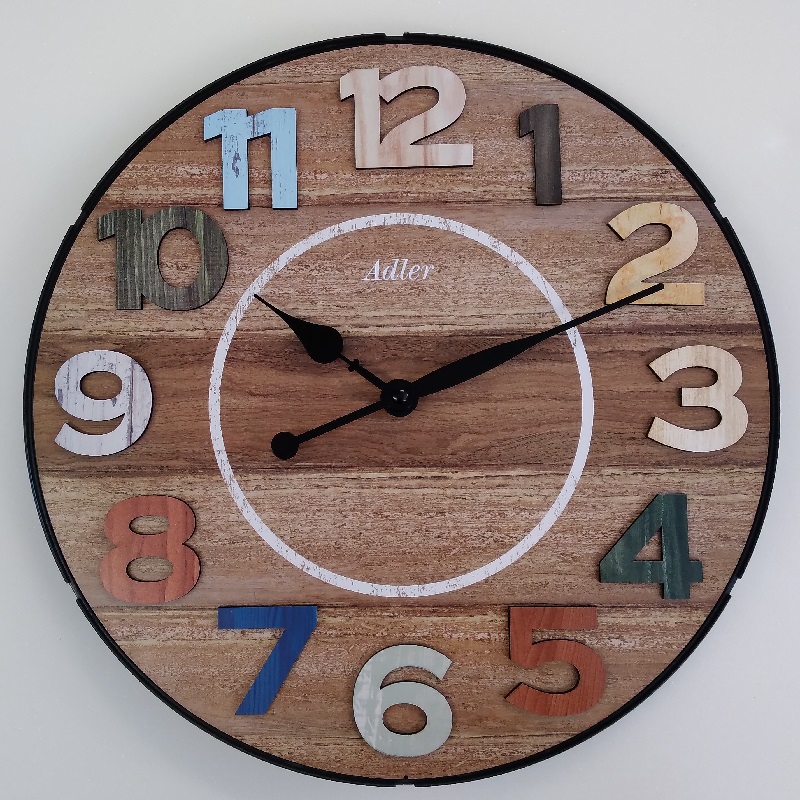 De wandklok heeft een houtlook wijzerplaat. De klok heeft een stil uurwerk met een slepende secon..
