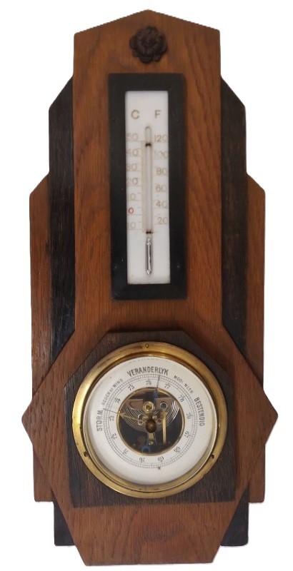 De aneroïde barometer met Nederlandse tekst heeft tevens een thermometer, ca. 1925. Het hout is e..
