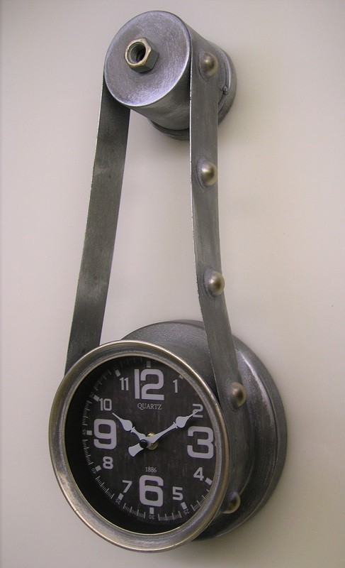 De grijze, metalen industriële klok hangt met een band aan een cilindervormige houder. De wandklok heeft een quartz uurwerk en de wijzers worden beschermd door een glas. Inclusief gratis batterij